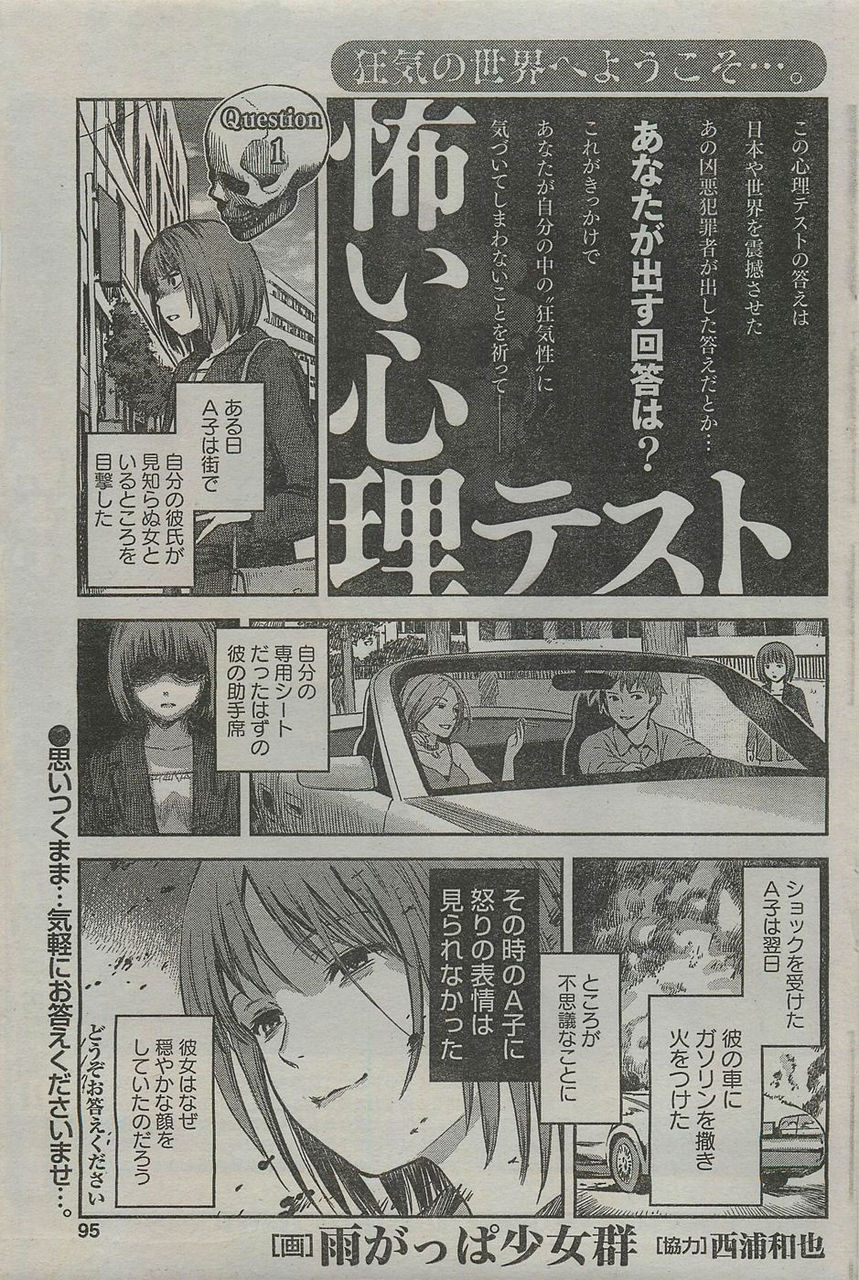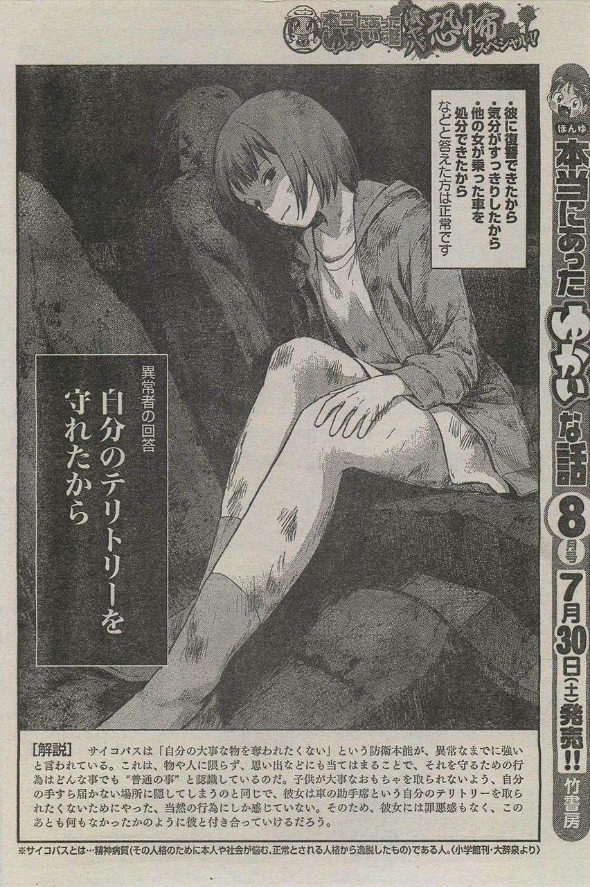 【解說】精神異常者對「不想被他人奪走自己的重要事物」這一防衛本能有著異常強烈的執著。不僅限於人事物,回憶等等也包含於此,而為了保護它們所採取的任何行動對異常者來說都是「正常」的。就像小孩子心愛的玩具被放到手觸及不到地方的而拿不到一樣,由於她不想讓她的助手席;也就是她的地盤被奪走所以理所當然地把車給燒了。因此她感受不到罪惡感,往後也會若無其事地跟她的男朋友繼續交往下去吧。