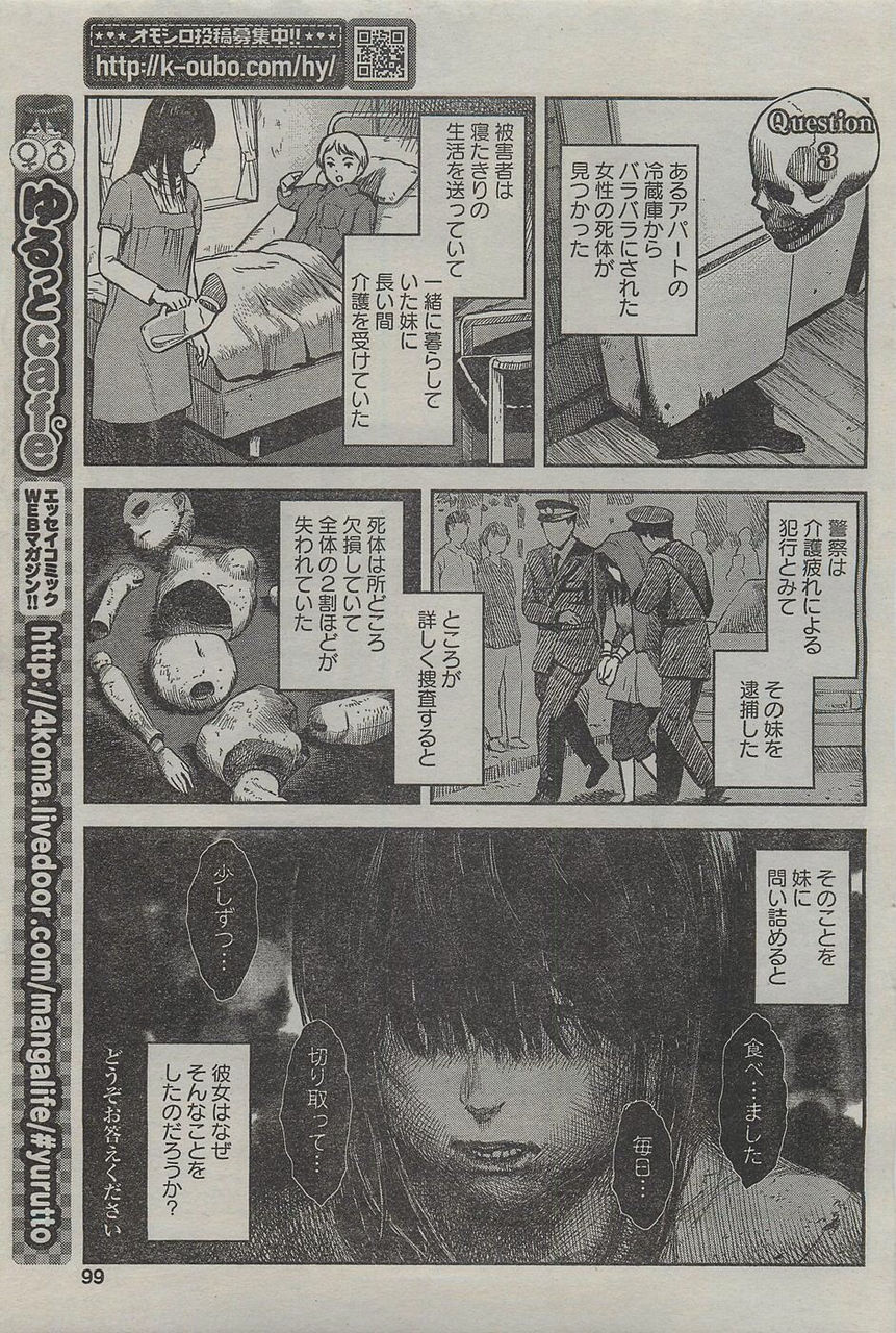 【解說】「cannibalism」(吃人)的衝動大多有著吃掉殺害的對方來追加殺人行為後的體驗之目的。殺掉人時的成就感與人之根本慾望「吃」交互重疊之下,可以藉由「吃」這個行為來反覆回味成就感。這個妹妹的情況為藉由吃姊姊來反覆享受從「照顧」解放出來的開放感。